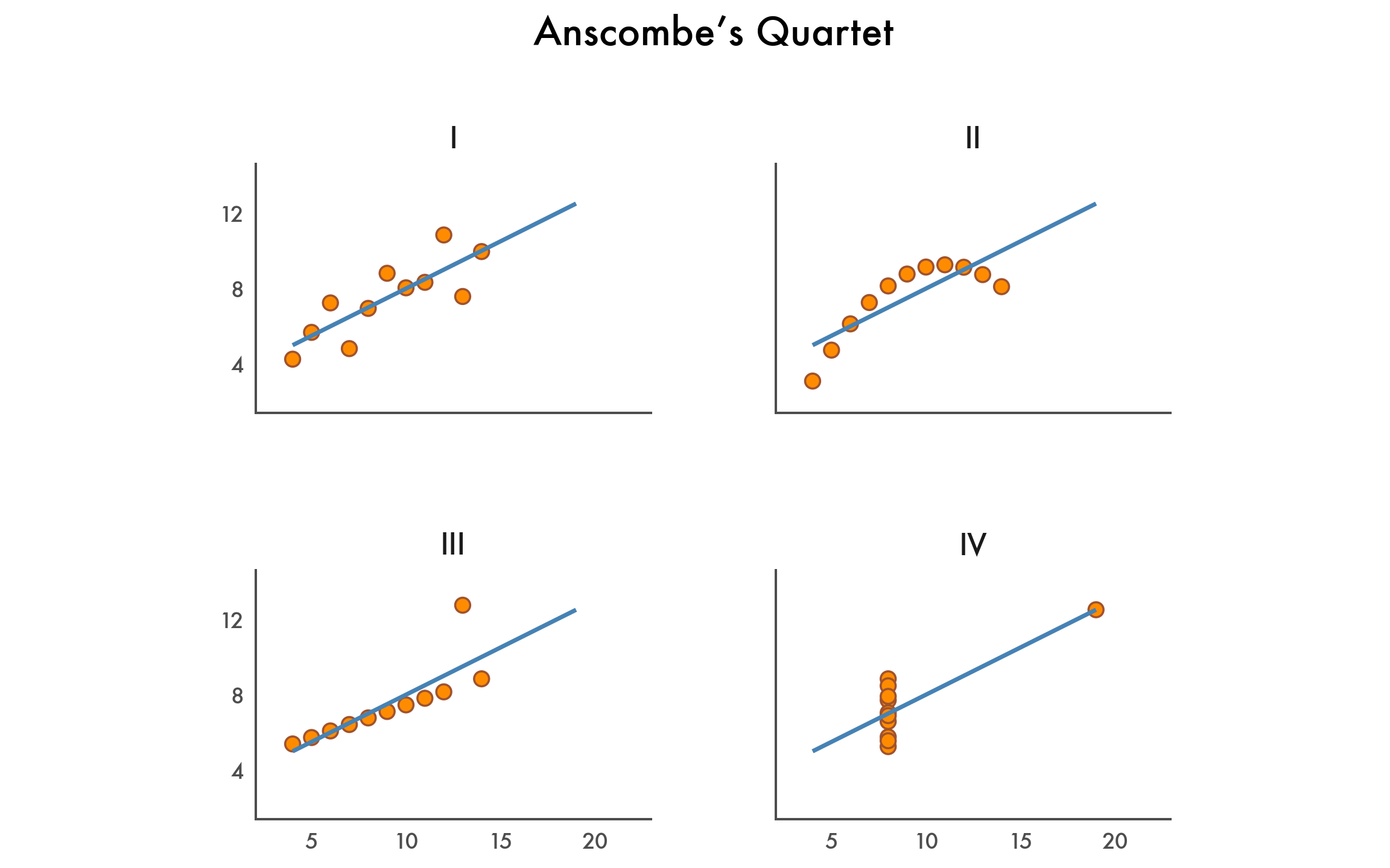 In 1973, statistician Francis Anscombe challenged the commonly held belief that “numerical calculations are exact, but graphs are rough” (Anscombe, 1973). His strategy was to manually construct four small datasets—now known as Anscombe’s Quartet—that have different distributions but nearly identical descriptive statistics. It’s perhaps the best argument for visualizing data.